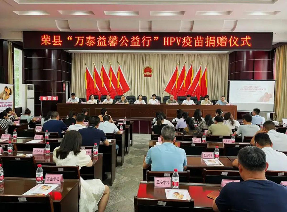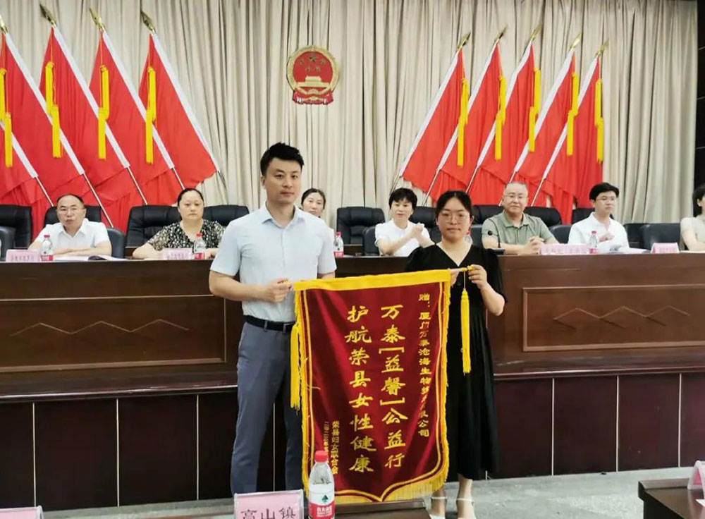 会上,宣读了“消除宫颈癌·巾帼在行动”倡议书;厦门万泰沧海生物技术有限公司向荣县捐赠320支馨可宁HPV疫苗(价值105280余元),定向用于帮助荣县困境女童群体接种HPV疫苗;县红十字会向厦门万泰颁发捐赠证书;县妇联向厦门万泰赠送锦旗。