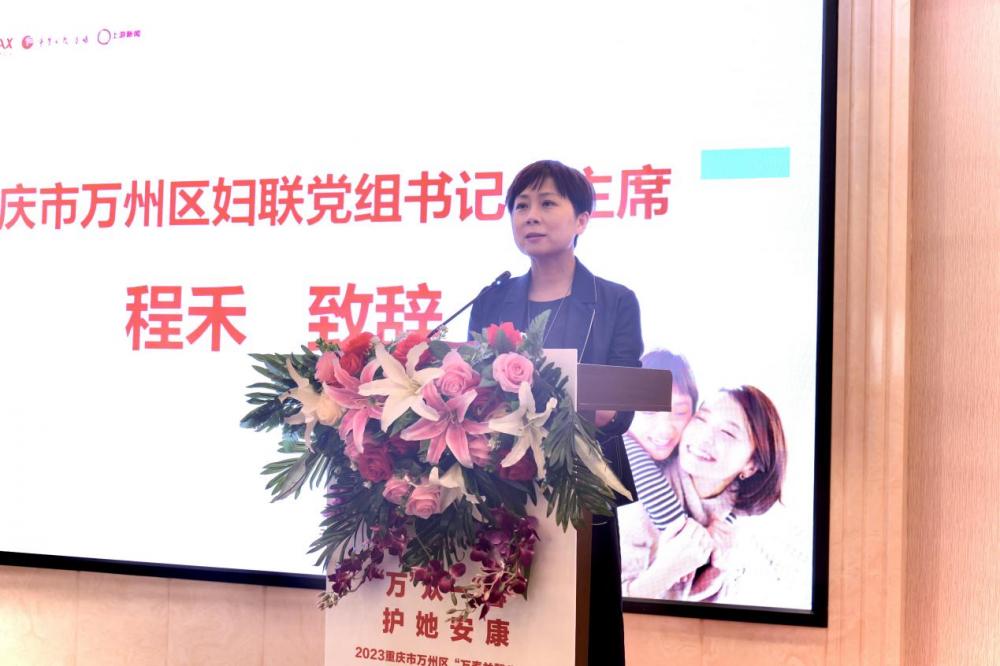 万州区妇联党组书记、主席程禾作开场致辞。她代表万州区妇女联合会以及受捐赠的妇女向重庆市妇女儿童基金会、厦门万泰表示感谢。程禾强调,救助是基础,预防才是关键,宫颈癌是威胁女性健康的严重疾病,也是迄今为止唯一可以用疫苗预防的癌症。她希望通过此次活动,让辖区广大妇女更加重视自身健康,提早做好疾病预防,在全社会形成关心关爱女性健康的浓厚氛围。
