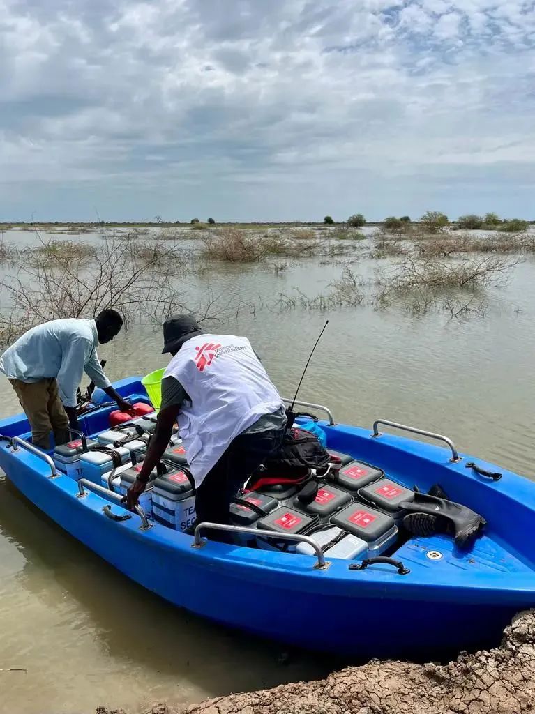 第三轮接种行动进行到一半,保护营地免遭洪水侵袭的堤坝决堤,淹没部分营地和道路,导致无国界医生驻地和营地之间无法通行。为了确保疫苗接种不间断,我们通过船只运输疫苗物资和团队人员。