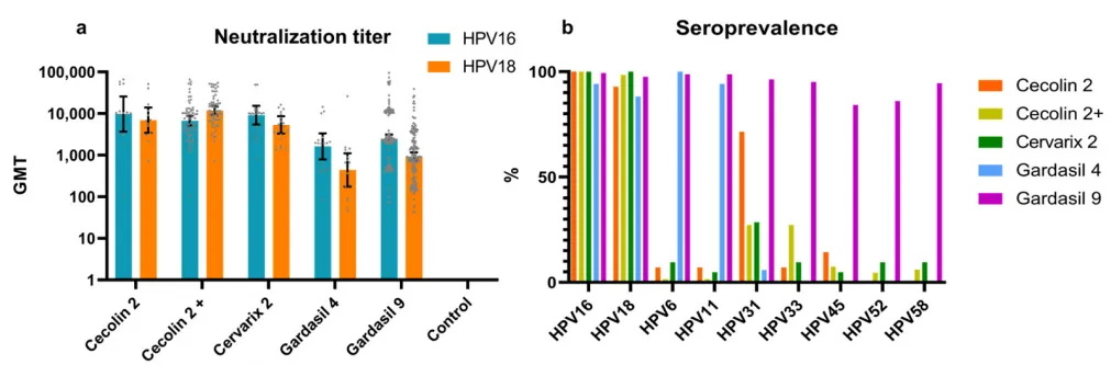 结果显示:国产二价Cecolin针对HPV16/18型抗体水平和血清抗体阳转率与“专利佐剂”加持的进口二价相似,优于四价和九价(p<0.001)。针对非疫苗型别HPV31/33型,国产二价表现出了比进口二价和四价更高比例的交叉反应性!