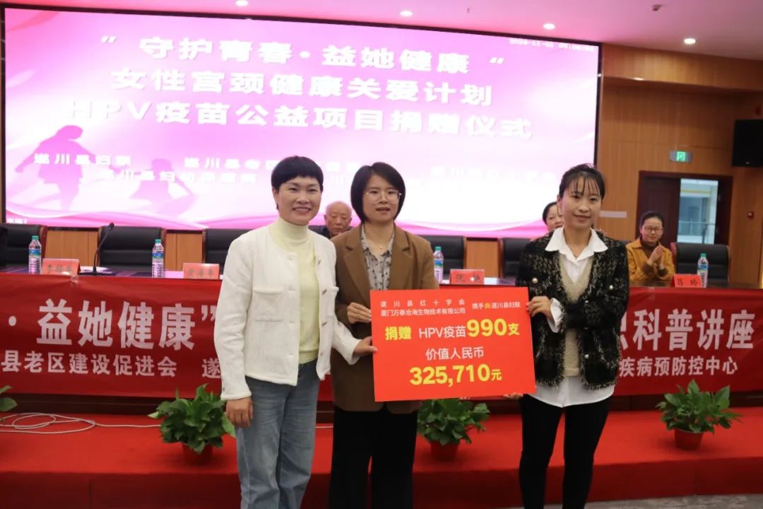 为积极响应国家卫健委、教育部、全国妇联等十部门联合发布的《加速消除宫颈癌行动计划(2023-2030年)》,推动宫颈癌防治工作,守护遂川女性健康,经协调,厦门万泰沧海生物技术有限公司共向遂川县捐赠990支价值325710元二价宫颈癌疫苗。近日,“守护青春 益她健康”女性宫颈癌关爱计划HPV疫苗公益项目捐赠仪式在遂川县妇幼保健院举行。
