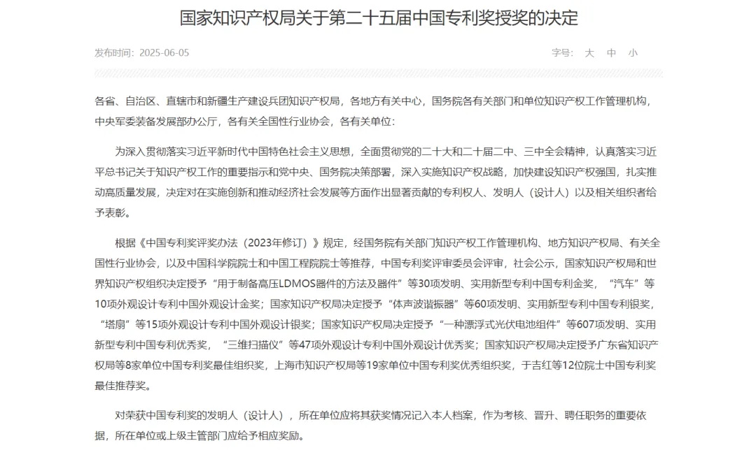 中国专利奖由国家知识产权局与世界知识产权组织共同主办,代表着我国知识产权领域的最高政府奖项,被誉为中国专利界的“皇冠明珠”。金奖项目更需具备显著的创新高度、突出的市场价值及广泛的社会影响力。本届中国专利奖共评选出金奖项目30项。