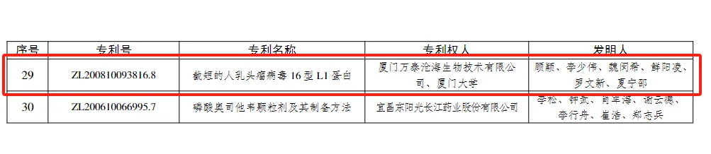 2025年6月5日,国家知识产权局公布第二十五届中国专利奖授奖决定。厦门万泰沧海生物技术有限公司(万泰疫苗)与厦门大学联合持有的发明专利——“截短的人乳头瘤病毒16型L1蛋白”(专利号:ZL 200810093816.8)荣获中国专利金奖!该金奖的发明人是顾颖、李少伟、魏旻希、鲜阳凌、罗文新、夏宁邵。