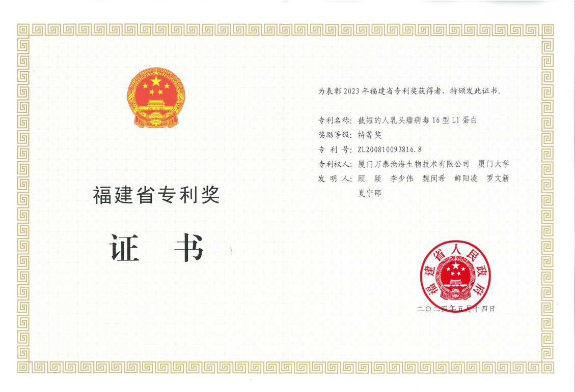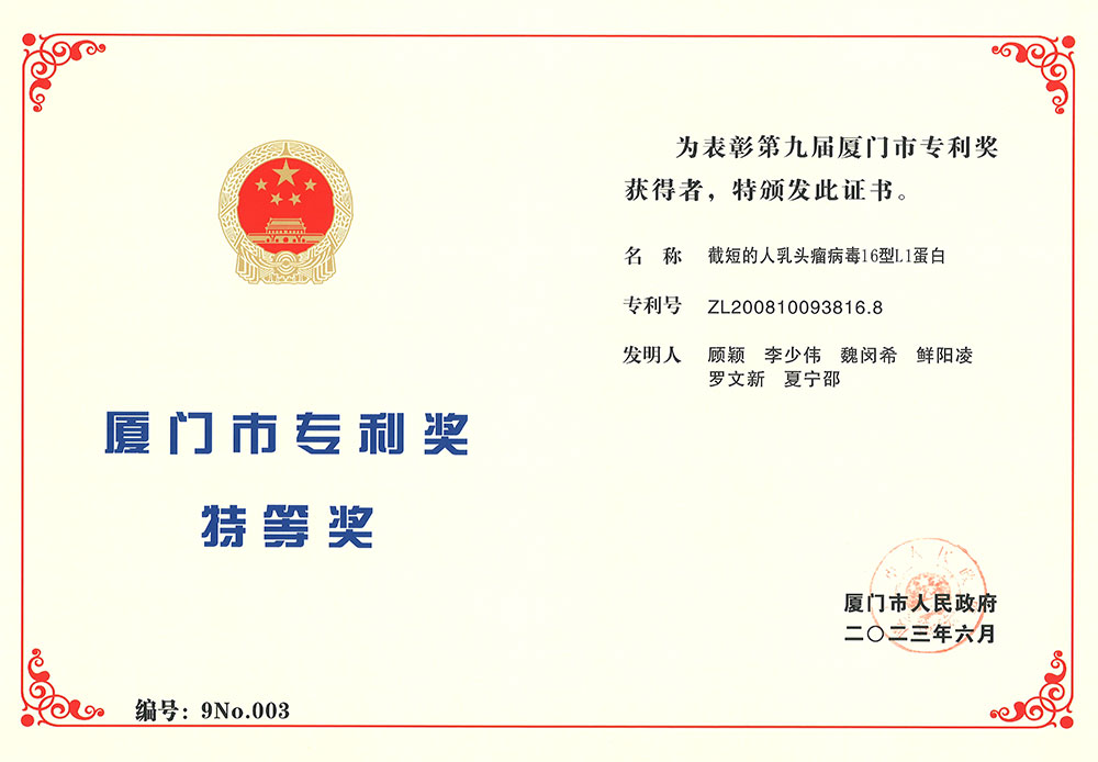 拥有9个型别的自主知识产权,其中“截短的人乳头瘤病毒16型L1蛋白”荣获中国专利金奖、福建省专利奖特等奖、厦门市专利奖特等奖。期间获国家科技部863课题支持,并被盖茨基金会纳入支持范畴。