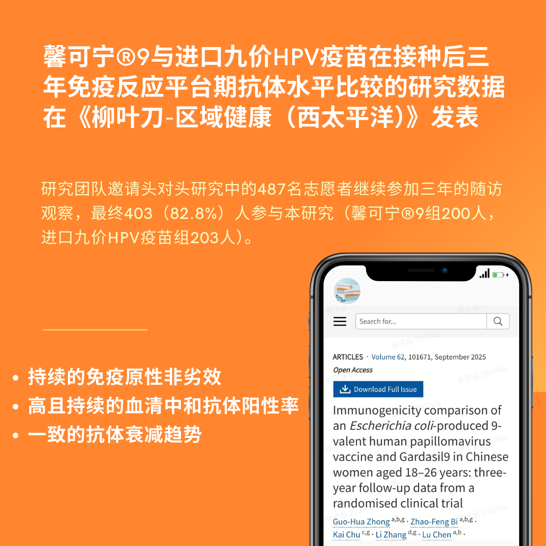 馨可宁®9与进口九价HPV疫苗在接种后三年免疫反应平台期抗体水平比较的研究数据在《柳叶刀-区域健康(西太平洋)》发表